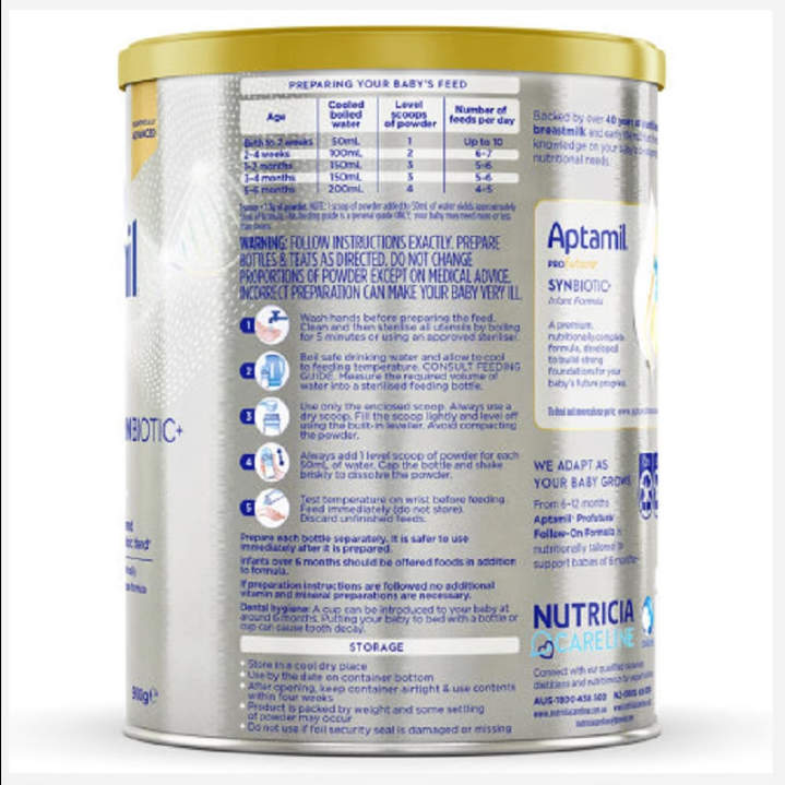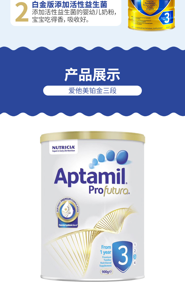 商品属性 [商品号] 9418783003421 [厂名] Aptamil [配料表] 乳清蛋白,omea3,叶黄素 [厂址] newzealand [厂家联系方式] 0800 688 742 [储藏方法] 存放在阴凉干燥处 [保质期] 550 [食品添加剂] 无 [包装方式] 包装 [重量(g)] 900 [品牌] aptamil/爱他美 [系列] 新西兰版 [规格] 900 [销售地] 新西兰 [适用年龄] 12个月 [适用阶段] 三段 [包装种类] 罐装 [原产地] 新西兰