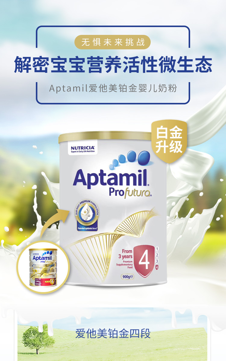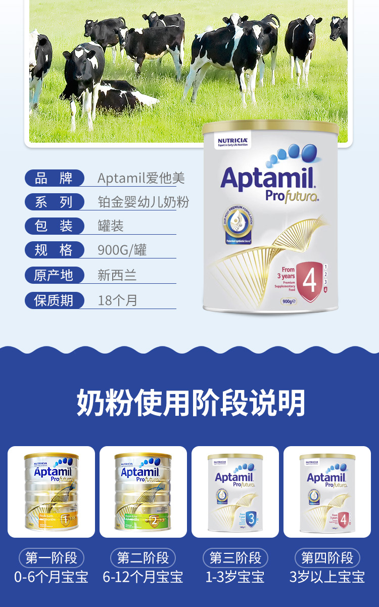 商品属性 [商品号] 9418783003438 [生产日期] 2015年06月01日 至 2015年06月03日 [厂名] Aptamil [配料表] 乳清蛋白,omea3,叶黄素 [厂址] newzealand [厂家联系方式] 0800 688 742 [储藏方法] 存放在阴凉干燥处 [保质期] 550 [食品添加剂] 无 [包装方式] 包装 [重量(g)] 900 [品牌] aptamil/爱他美 [系列] 新西兰版 [规格] 900 [销售地] 新西兰 [适用年龄] 12个月 [适用阶段] 四段 [包装种类] 罐装 [原产地] 新西兰