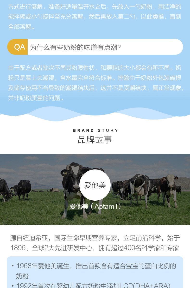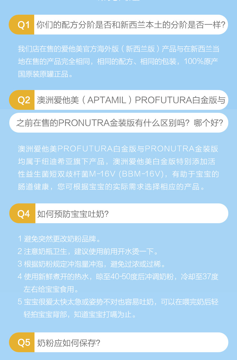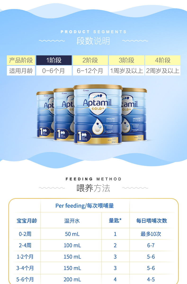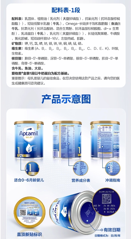 商品属性 [厂名] Aptamil [商品号] 9418783002820 [配料表] 乳清蛋白,omea3,叶黄素 [厂址] newzealand [厂家联系方式] 0800 688 742 [储藏方法] 存放在阴凉干燥处 [保质期] 550 [食品添加剂] 无 [包装方式] 包装 [品牌] aptamil/爱他美 [重量(g)] 900 [规格] 900 [系列] 新西兰版 [销售地] 新西兰 [适用年龄] 12个月 [适用阶段] 一段 [包装种类] 罐装 [原产地] 新西兰 [生产日期] 2015年06月01日 至 2015年06月03日