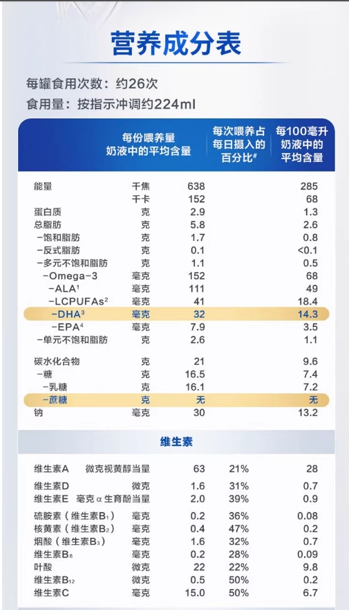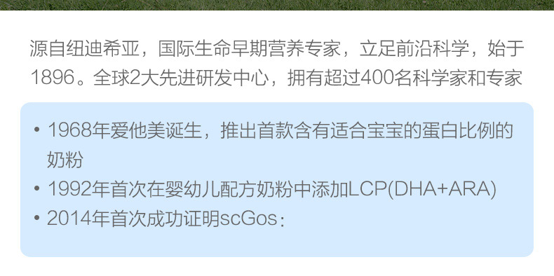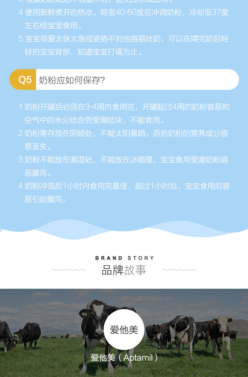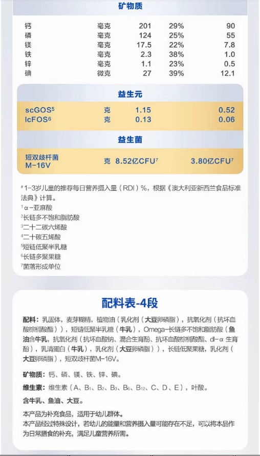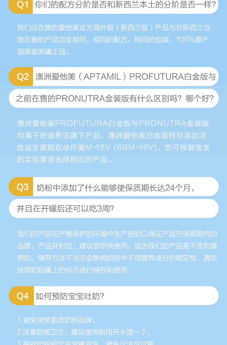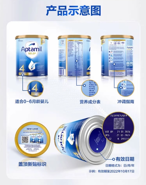 商品属性 [商品号] 9418783002851 [厂名] Aptamil [配料表] 乳清蛋白,omea3,叶黄素 [厂址] newzealand [厂家联系方式] 0800 688 742 [储藏方法] 存放在阴凉干燥处 [食品添加剂] 无 [保质期] 550 [包装方式] 包装 [重量(g)] 900 [品牌] aptamil/爱他美 [系列] 新西兰版 [规格] 900 [销售地] 新西兰 [适用年龄] 12个月 [包装种类] 罐装 [原产地] 新西兰 [生产日期] 2015年06月01日 至 2015年06月03日 [适用阶段] 四段
