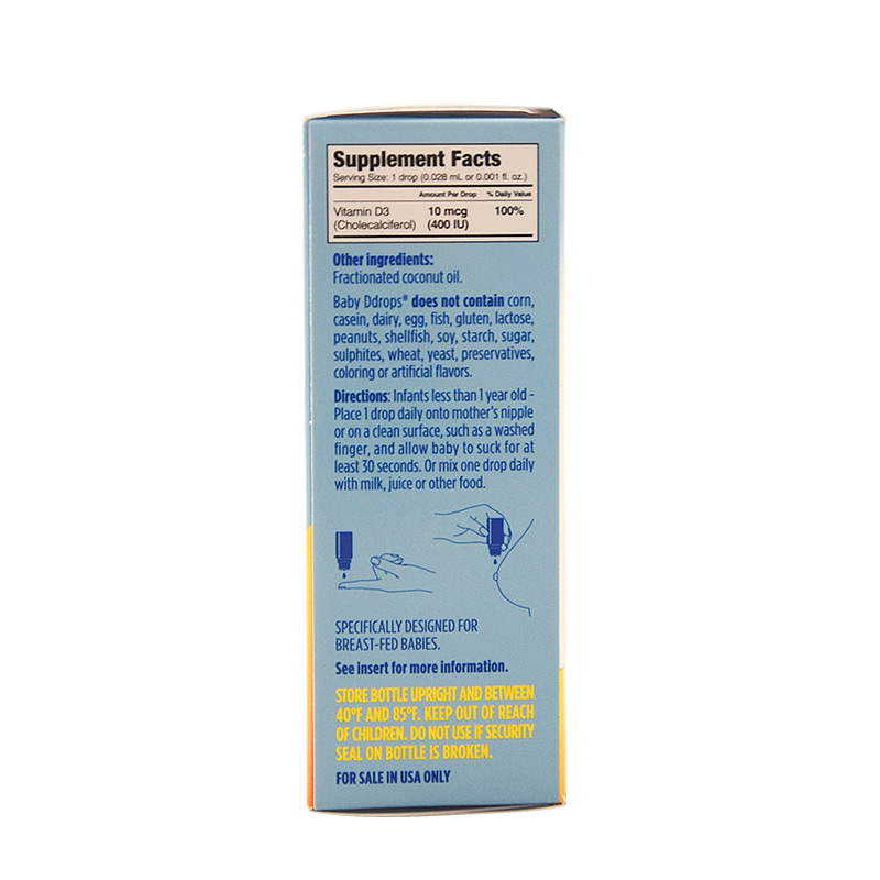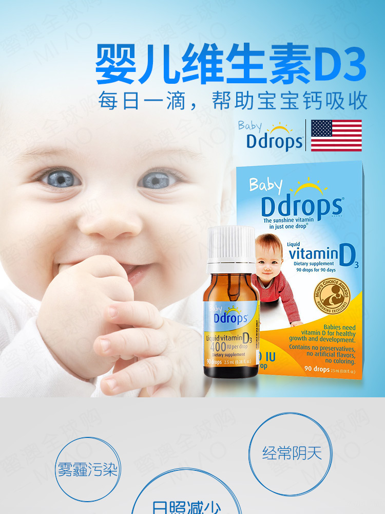 美国Baby ddrops婴儿维生素D3 宝宝补钙滴剂400IU 2.5ml 90滴