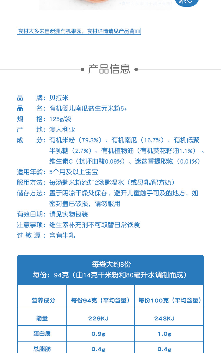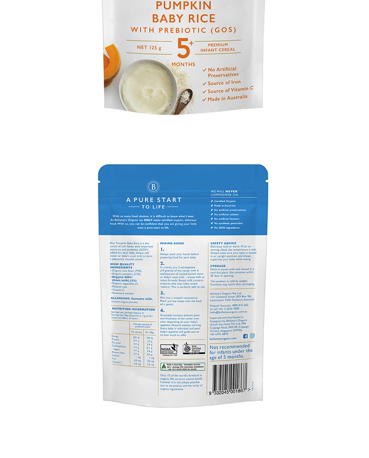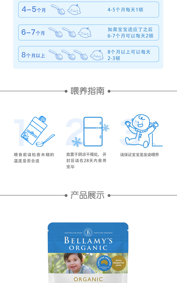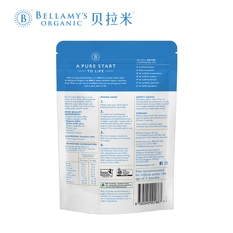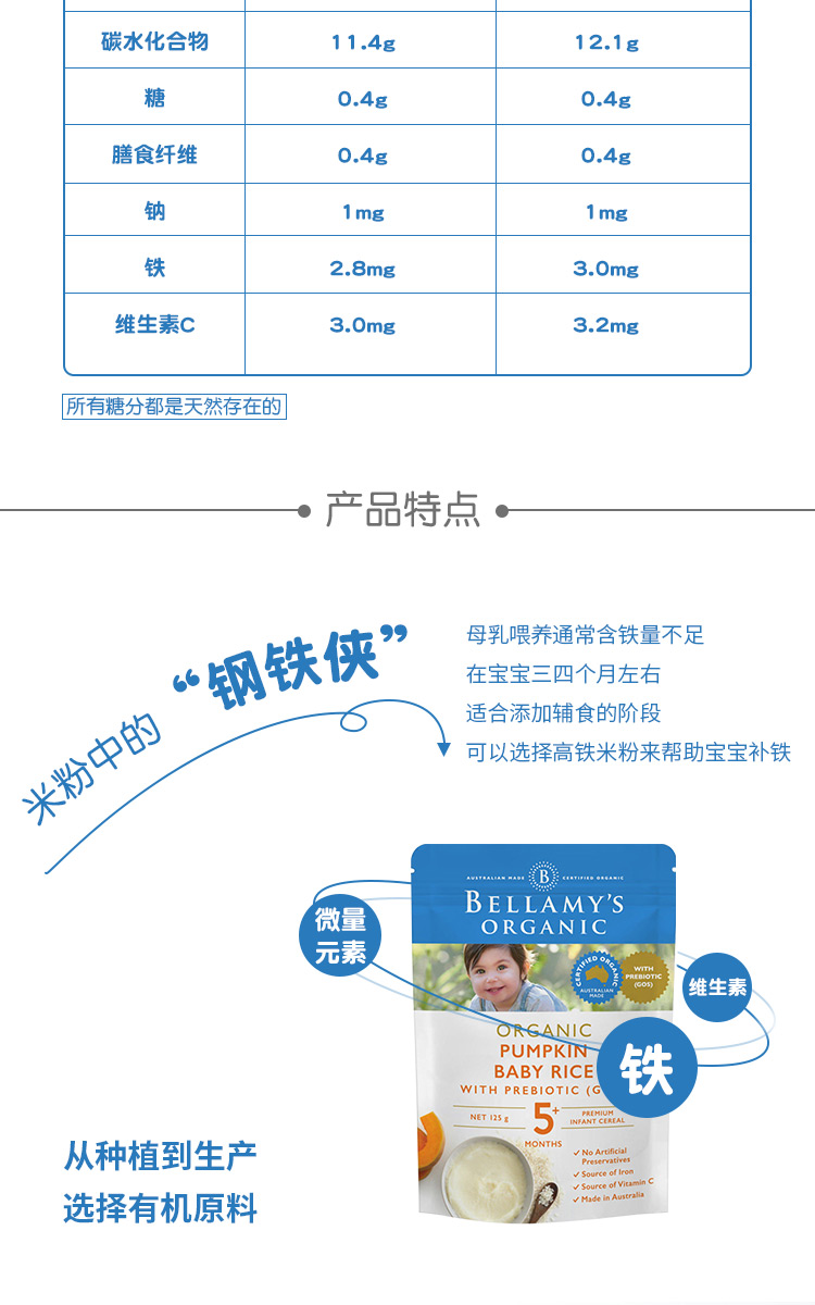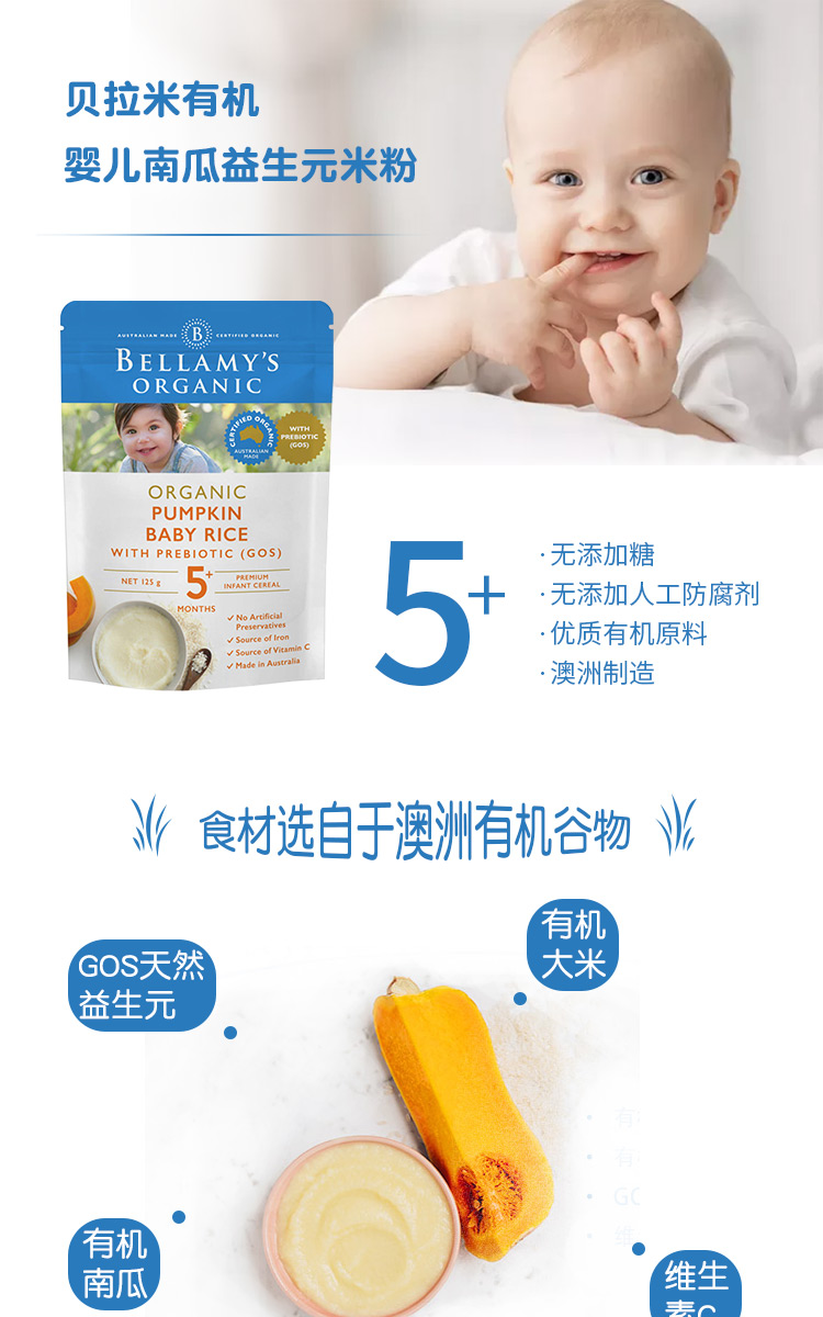 24.6月贝拉米有机婴儿原味益生元GOS高铁米粉米糊 4+ 原味