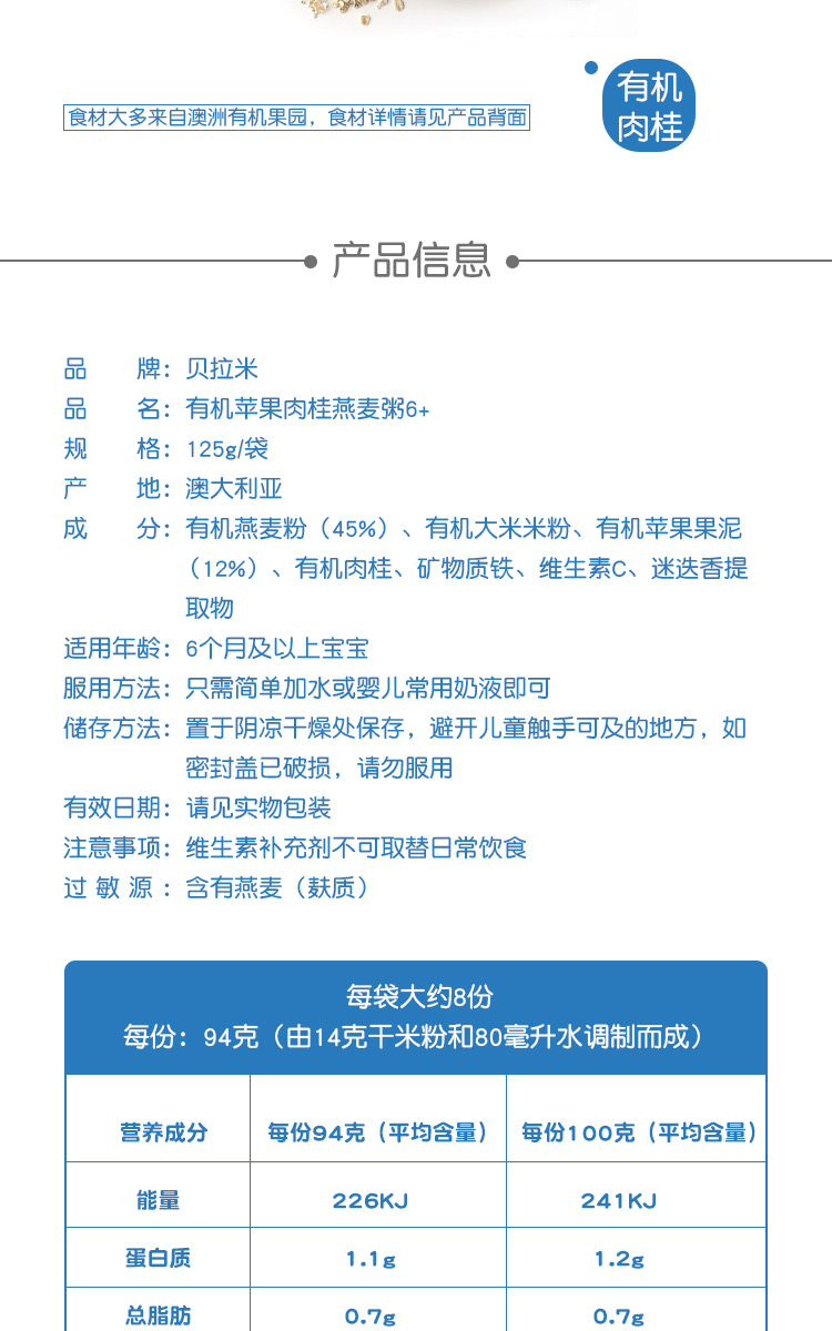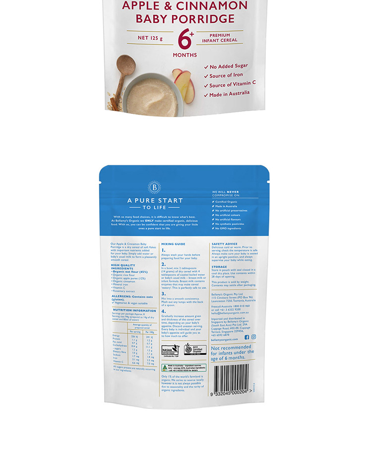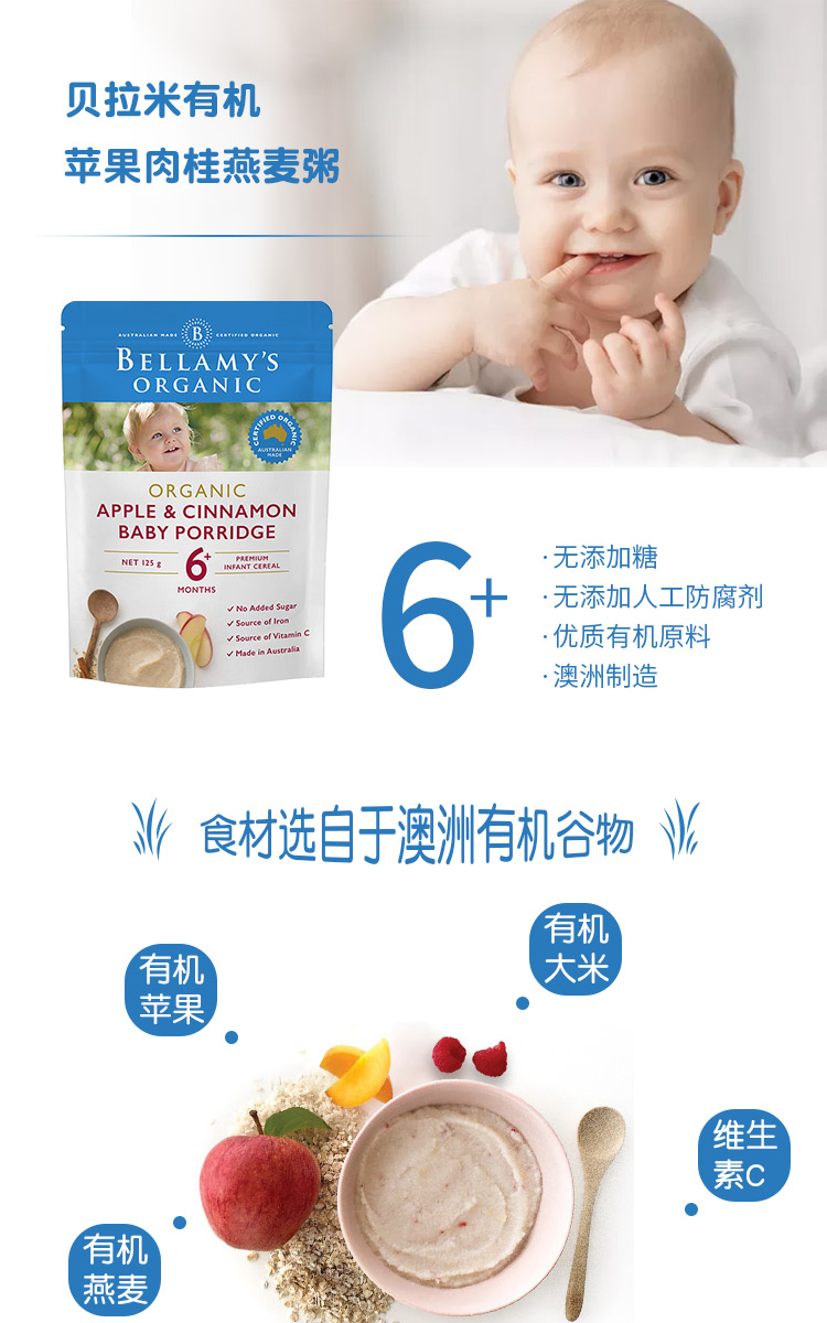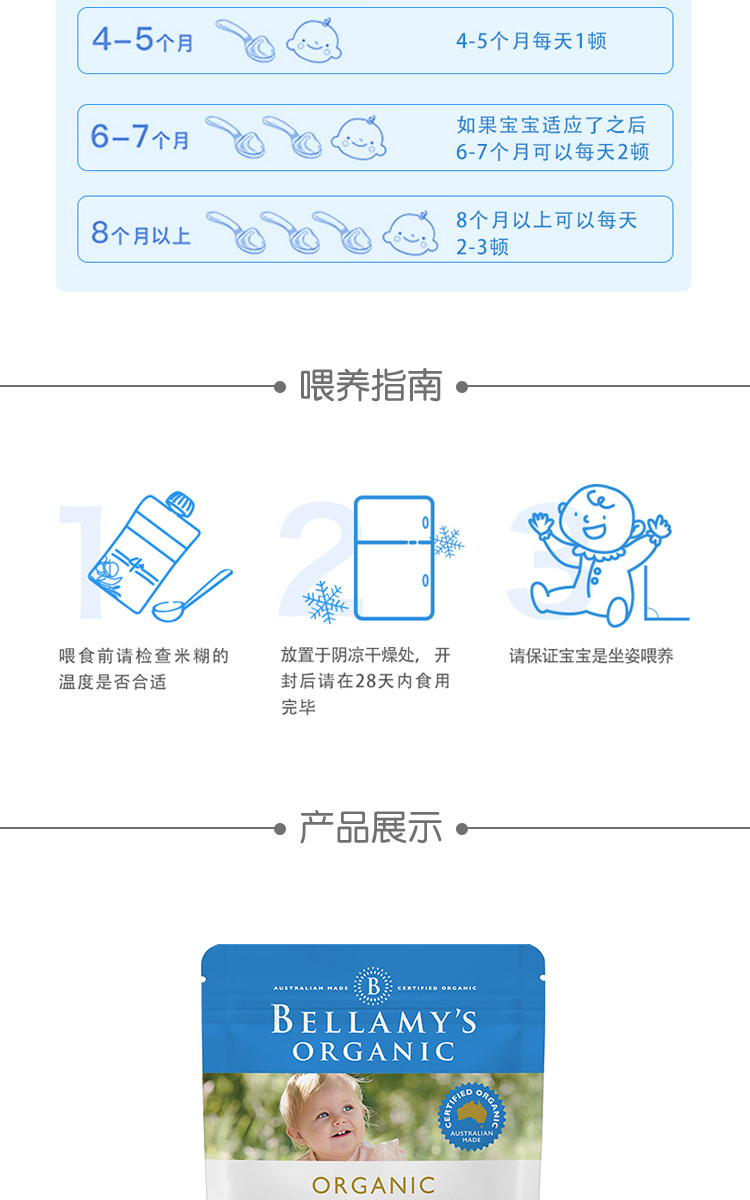 24.6月贝拉米有机婴儿原味益生元GOS高铁米粉米糊 4+ 原味